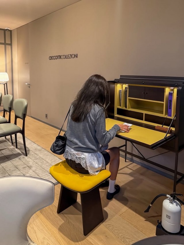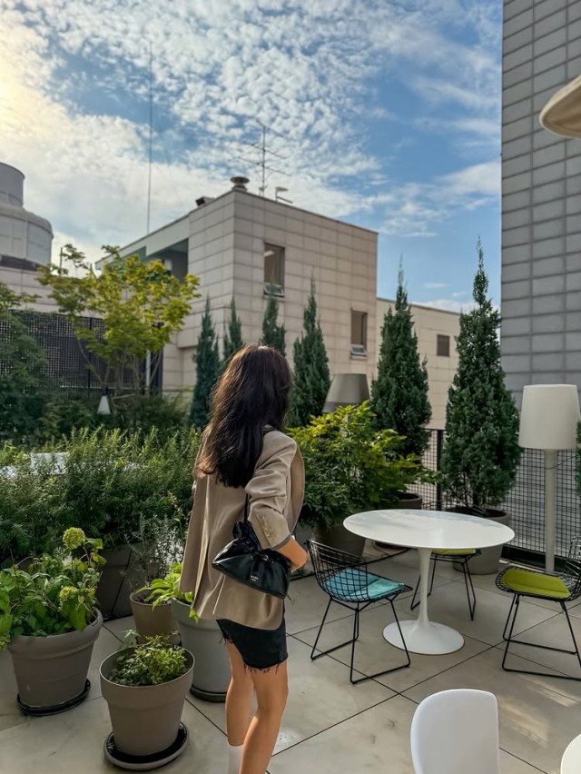 Trong không gian sân thượng hòa quyện giữa chậu cây, bàn ghế và mái che, Chae Jung An tạo nên bầu không khí thư thái dưới ánh nắng, và với chiếc túi cùng laptop bên cạnh, cô thể hiện hình ảnh tận hưởng thời gian riêng dù trong guồng quay bận rộn. Bên trong quán cà phê, hình ảnh trà và món tráng miệng được bày biện cũng được tiết lộ, cho thấy cuộc sống gọn gàng mà thoải mái.