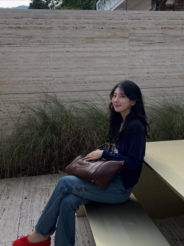 Gần đây, Suzy đã thể hiện phong cách casual thoải mái nhưng vẫn thanh lịch với áo cardigan màu xanh navy, áo thun trắng và quần jeans. Trong bức ảnh chụp ngoài trời với nền là bức tường đá và bãi cỏ, cô ngồi cầm túi CELINE bằng một tay và nhìn thẳng về phía trước. Đặc biệt, cô kết hợp dép lê màu đỏ tạo điểm nhấn rực rỡ cho tổng thể trang phục, thể hiện vẻ quyến rũ tự nhiên. Trong bức ảnh chụp nghiêng, cô mỉm cười với biểu cảm như đang suy tư, tạo nên không khí thân thiện và ấm áp.
