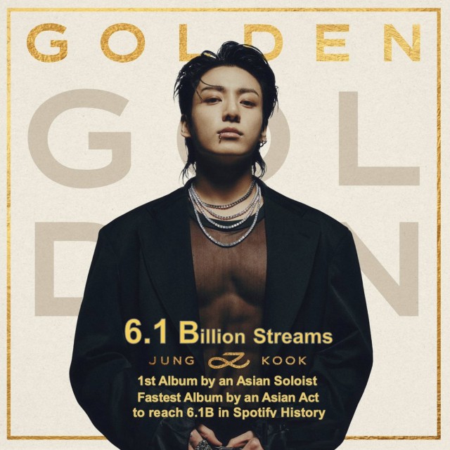 Album solo 'GOLDEN' của Jungkook thuộc nhóm nhạc BTS đã vượt mốc 6,1 tỷ lượt phát trực tuyến trên Spotify, thiết lập kỷ lục mới. 'World Music Awards' (WMA) đã công bố số liệu lượt phát trực tuyến của 'GOLDEN' qua tài khoản chính thức. Album này là album đầu tiên của nghệ sĩ solo châu Á đạt được thành tích này và cũng là album chính thức của nghệ sĩ châu Á đạt 6,1 tỷ lượt phát trực tuyến trong thời gian ngắn nhất.