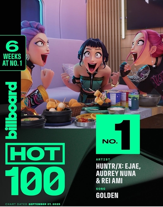 Bài hát OST 'Golden' của phim hoạt hình Netflix 'K-Pop Demon Hunters' đã thiết lập kỷ lục lần thứ 6 đứng đầu bảng xếp hạng đĩa đơn Billboard Hot 100 của Mỹ. Billboard đã công bố vào ngày 22 (theo giờ địa phương) trong bài viết dự báo bảng xếp hạng rằng 'Golden' tiếp tục giữ vị trí số 1 tuần thứ 6 trên Hot 100. 'Golden' lần đầu tiên xuất hiện trên bảng xếp hạng này vào tháng 7 với vị trí thứ 81, đã duy trì trên bảng xếp hạng liên tục 13 tuần và hiện đang giữ vị trí số 1 trong 5 tuần liên tiếp.