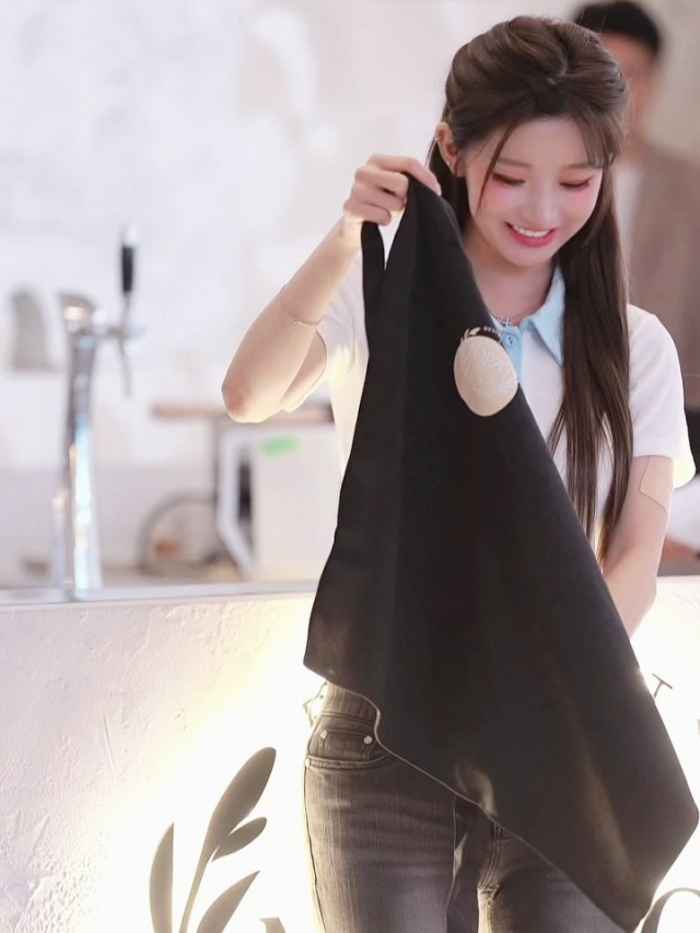 Trong một bức ảnh khác, cô cũng thể hiện hình ảnh tập trung khi cẩn thận đựng thức ăn. Nhiều bát đĩa và dụng cụ ăn uống đặt trên bàn một cách tự nhiên thể hiện niềm vui nhỏ bé trong cuộc sống hàng ngày, tăng thêm sự thân thiện. Ngoài ra, cảnh cô cầm tạp dề đen và nhìn thẳng về phía trước tỏa ra năng lượng sạch sẽ và sôi nổi đã chiếm trọn trái tim người hâm mộ.