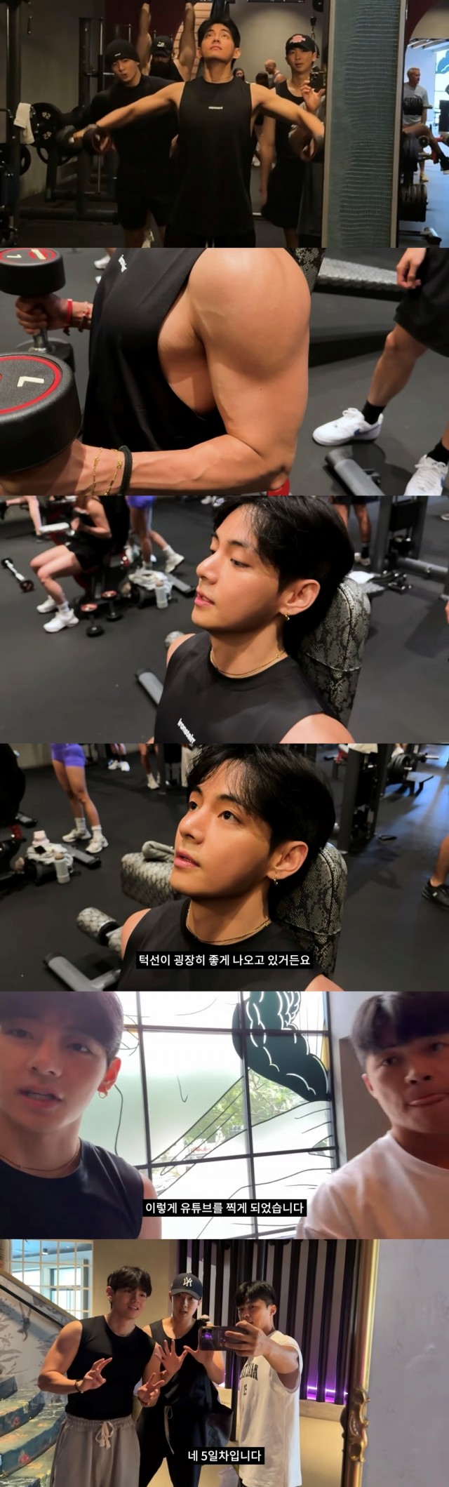 V mặc áo ba lỗ màu đen và tập luyện tay với tạ nặng. Anh khoe đường nét hàm sắc sảo và dù bài tập khó khăn, vẫn giữ biểu cảm thoải mái, không nhăn mặt. Ma Sunho đã giúp V chỉnh sửa tư thế khi tập với máy kéo thấp. Dù bài tập vất vả, V vẫn không mất nụ cười, trêu đùa các thành viên tạo không khí vui vẻ.