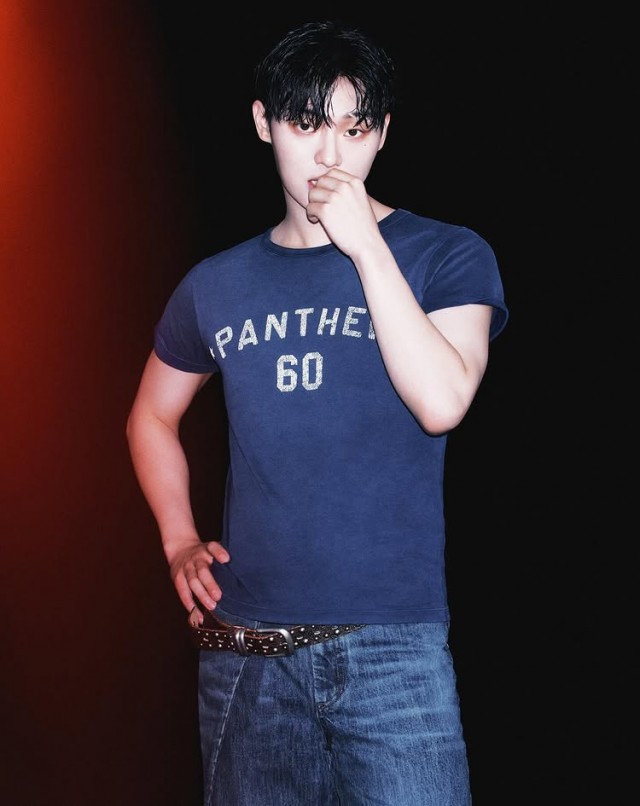 Khi mặc áo thun xanh và quần jeans, anh đứng dưới ánh đèn màu cam trên phông nền đen đơn sắc, thể hiện nhiều tư thế khác nhau. Đặc biệt, cảnh anh dùng ngón tay nhẹ nhàng che môi và nhìn thẳng vào ống kính đã làm nổi bật vẻ ngoài tinh tế và bầu không khí sang trọng.