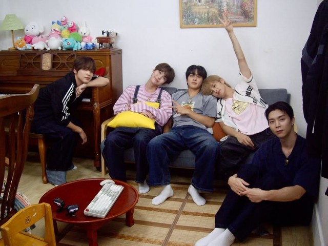 Trong bức ảnh, các thành viên mặc trang phục casual thoải mái như áo thun trắng tay ngắn kết hợp với quần jeans, áo thun xám và quần jeans, quần yếm màu hồng tạo nên không khí đời thường. Trong phòng khách có rèm cửa sáng và ghế sofa, các thành viên ngồi quanh bàn với dụng cụ ăn uống, đồ uống và đĩa bày trên bàn, thể hiện vẻ tự nhiên như không cố ý.