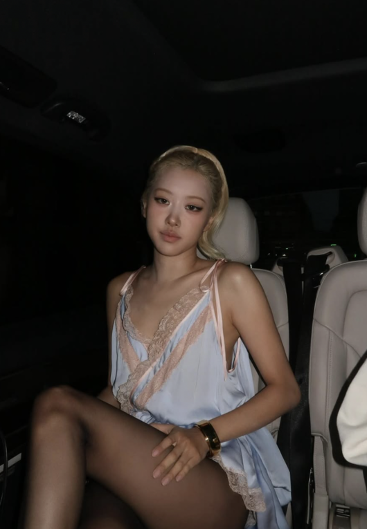 Rosé của BLACKPINK đã thu hút sự chú ý với phong cách slip dress táo bạo. Vào ngày 29, Rosé đã đăng tải nhiều bức ảnh trên SNS của mình. Trong những bức ảnh được công bố, Rosé mặc chiếc váy slip màu xanh da trời điểm xuyết chi tiết ren màu hồng nhạt, ngồi trong xe và nhìn thẳng vào máy ảnh. Cô kết hợp tất đen và vòng kim loại to bản tạo nên phong cách mạnh mẽ, cùng với kiểu tóc vàng buộc cao làm nổi bật tổng thể không khí. Dù trong ánh sáng tối, các đường nét khuôn mặt rõ ràng và biểu cảm điềm tĩnh của cô vẫn nổi bật.