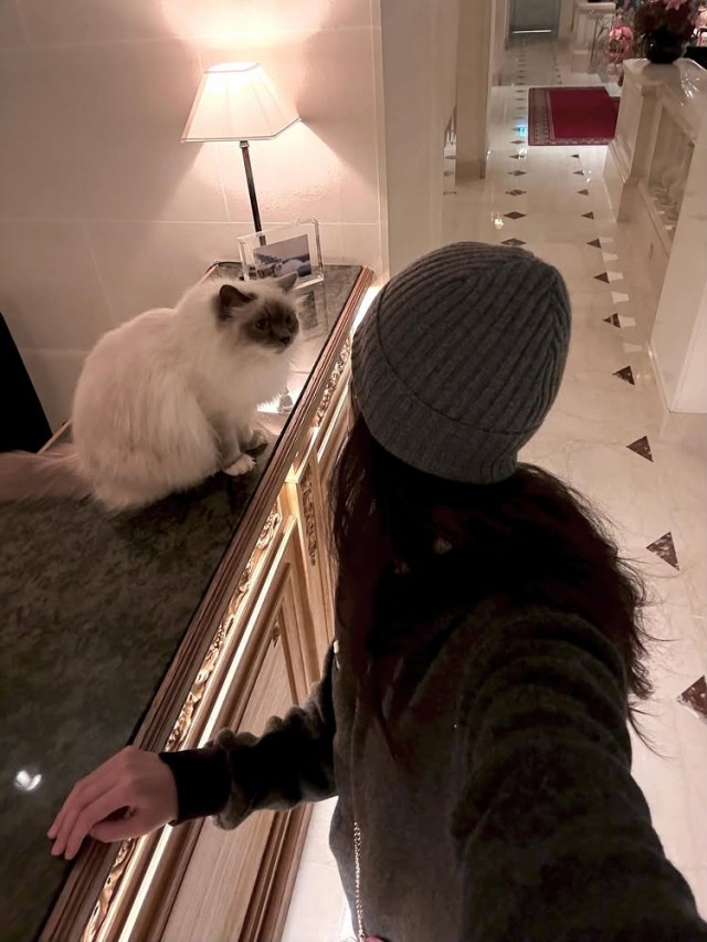 Ngoài ra, cô còn công khai một bức ảnh selfie nhìn chú mèo khi đang mặc áo khoác đen, đội mũ và đeo khẩu trang. Jisoo ngồi trên ghế sofa, chụp cùng hoa và túi xách, thể hiện một cách tự nhiên hình ảnh tự do trong cuộc sống thường ngày.