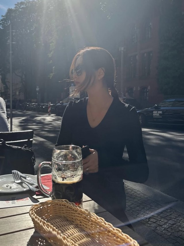 Trong một bức ảnh khác, dưới ánh đèn màu rượu vang đậm, cô mặc trang phục dài màu đen và đi bộ quay lưng lại trước kho rượu vang làm nền, đồng thời cũng có hình ảnh cô mặc áo màu xám đứng trước bức tường gạch, nhìn sâu sắc vào máy ảnh. Ở quán cà phê ngoài trời, cô ngồi trên ghế với áo thun dài tay màu đen, tay cầm ly bia, tận hưởng thời gian thư giãn.