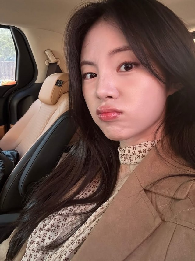 Đặc biệt, hình ảnh cô mặc áo blouse trắng nhìn nghiêng nhẹ và cảnh nhìn ra ngoài cửa sổ thấy tàu hỏa và cây cối tạo nên không khí trong trẻo. Bức ảnh selfie trong xe với áo sơ mi hoa và áo khoác màu nâu, tạo dáng chữ V và bĩu môi cũng thu hút sự chú ý.