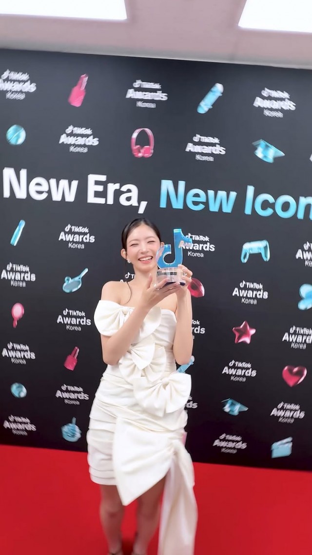 Nhóm nhạc nữ IVE gần đây đang nhận được sự quan tâm lớn trên SNS. Trong bài đăng trên tài khoản chính thức, thành viên Rei mặc chiếc váy trễ vai màu trắng, hơi nghiêng người về phía trước và cầm chiếc cúp trong khi mỉm cười, thu hút sự chú ý. Phông nền có nhiều biểu tượng và chữ viết đa dạng, truyền tải không khí của sự kiện.