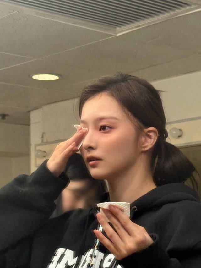 Trong một bức ảnh khác, cô mặc áo hoodie màu đen và tập trung trang điểm. Cảnh cô buộc tóc và sử dụng mỹ phẩm với biểu cảm nghiêm túc tạo cảm giác chân thực.
