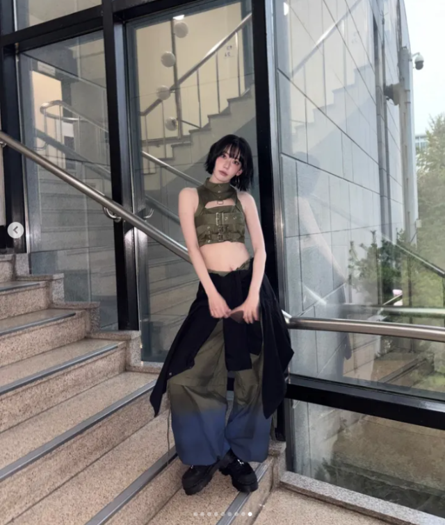 Sakura mặc áo crop top cổ cao màu kaki mang phong cách quân đội. Chiếc áo này có thiết kế cắt xẻ táo bạo với khóa cài và phụ kiện kim loại ở giữa ngực và phần bụng, làm nổi bật vẻ quyến rũ sành điệu. Với kiểu dáng để lộ vòng eo, Sakura kết hợp cùng quần rộng rãi và buộc áo khoác quanh eo tạo nên phong cách đường phố. Phong cách này thể hiện cá tính mạnh mẽ của Sakura và làm nổi bật hình ảnh biểu tượng thời trang của cô.