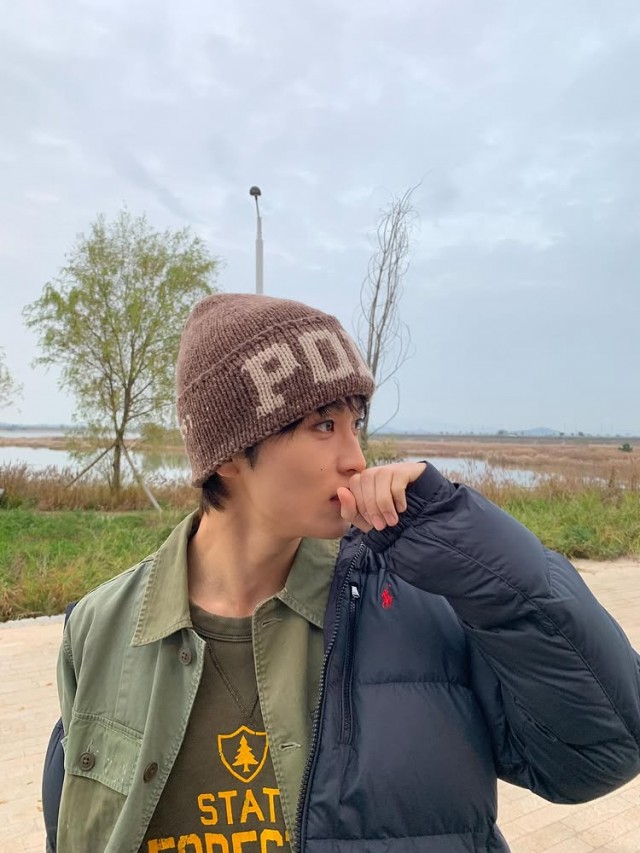 Trong bức ảnh được công bố, Mark kết hợp mũ beanie màu nâu và áo khoác phao màu đen, tạo nên phong cách mùa đông gọn gàng nhưng vẫn ấm áp. Hình ảnh anh nhìn thẳng vào ống kính với bầu trời xanh làm nền tạo nên không khí trầm lắng và sâu sắc. Tiếp đó, anh mặc áo khoác màu ô liu và quần đen, đi dạo tự nhiên quanh công viên và bờ sông, tạo nên không gian thư thái.
