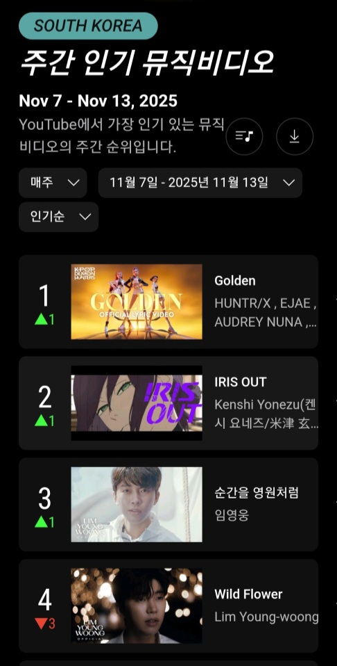 Video âm nhạc phổ biến hàng tuần tại Hàn Quốc tuần này đứng đầu là OST 'Golden' của Netflix trong 'K-pop Demon Hunters', vị trí thứ 2 thuộc về OST 'IRIS OUT' của phim điện ảnh hoạt hình Nhật Bản 'Chainsaw Man Reze Arc'. Điều này càng làm nổi bật sự hiện diện của Lim Young Woong.