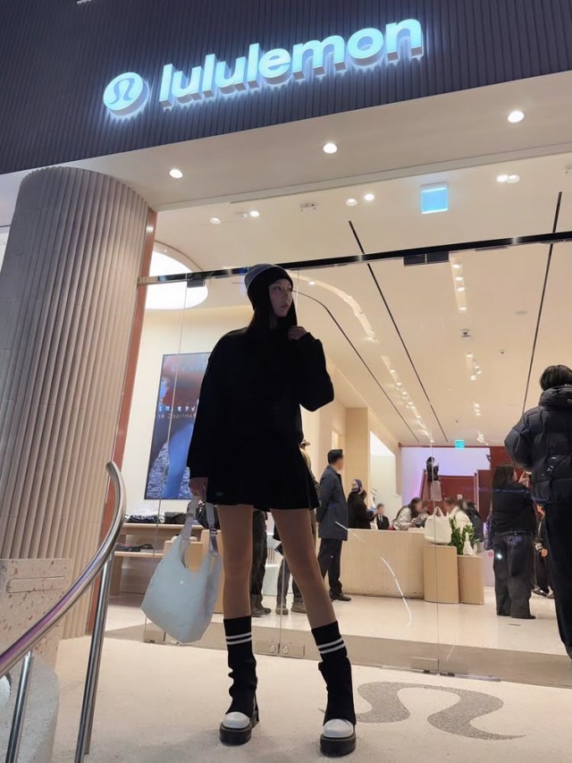 Han Hye-jin kết hợp áo sweatshirt màu đen với chân váy ngắn và đội mũ, thể hiện vẻ ngoài thời thượng nhưng vẫn rất casual. Bên trong sự kiện, các sản phẩm của Lululemon được trưng bày phân chia theo từng tầng, thu hút khách mua sắm, và Han Hye-jin không chỉ quan tâm đến dòng athleisure mà cô yêu thích mà còn dành sự chú ý lớn cho các sản phẩm dòng casual.
