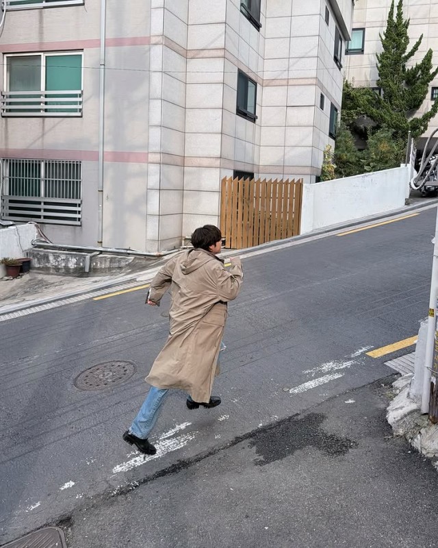Đặc biệt, ánh nắng mùa thu nhẹ nhàng chiếu xuống con hẻm và tông màu trang phục trầm ấm hòa quyện với phong cách sống tinh tế của Jang Geun-suk, tạo nên một bức tranh tuyệt đẹp.