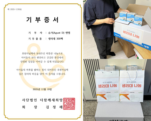 [The Fact | Phóng viên Son Haeri] Người hâm mộ của SUGA (BTS) tiếp tục thực hiện hoạt động thiện nguyện ý nghĩa. Nhóm fan “SUGA Angels” đã quyên góp 300 gói băng vệ sinh cho các bé gái sống trong gia đình đơn thân, góp phần lan tỏa sự ấm áp trong mùa cuối năm.