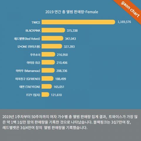 Gaon Chart đã thống kê lượng tiêu thụ album từ tuần thứ 1 đến tuần 50 của năm 2019, top 10 theo thứ tự lần lượt là BTS, SEVENTEEN, TWICE, EXO, X1, GOT7, Stray Kids, Baek Hyun, MONSTA X, Kang Daniel.