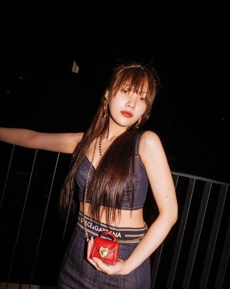 bức hình. Joy buộc tóc 1 nửa đầu, khí chất thuần khiết, áo dây denim với váy ngắn,